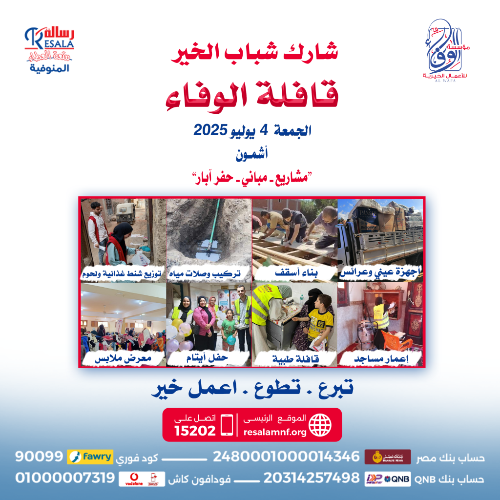 تنظم جمعية رسالة للأعمال الخيرية قافلة الوفاء التابعة لمؤسسة الوفاء الخيرية في خلال الأيام القادمة وذلك لتقام في يوم الجمعة الموافق 4 يوليو 2025، وتهدف هذه القافلة إلى عدة أنشطة خيرية وتشمل: